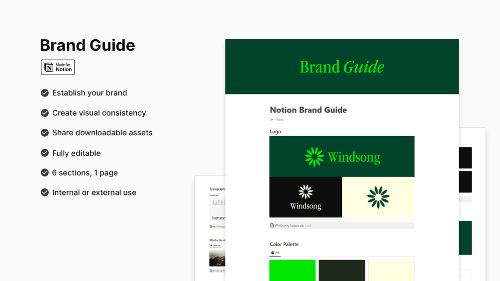 Meet the Notion Brand Guide – an editable & shareable page streamlining brand management. Serving as a centralized hub, it meticulously documents all facets of your brand, from logos to multimedia assets, with a standout Asset Library for easy organization.