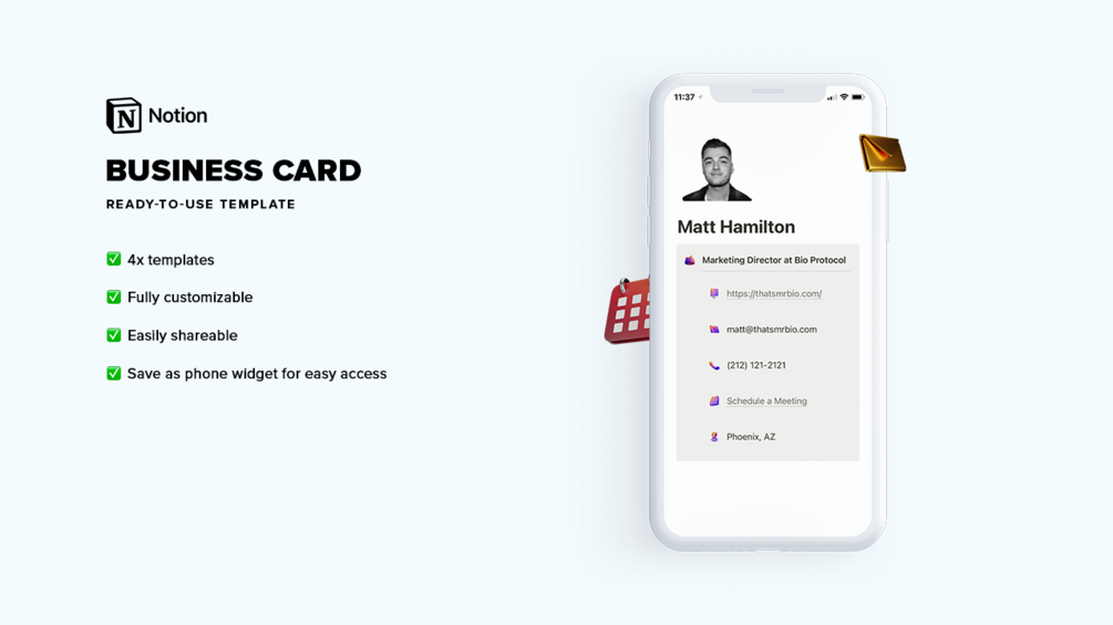 Personalize and share your new business card, all built as an easily customizable Notion template.