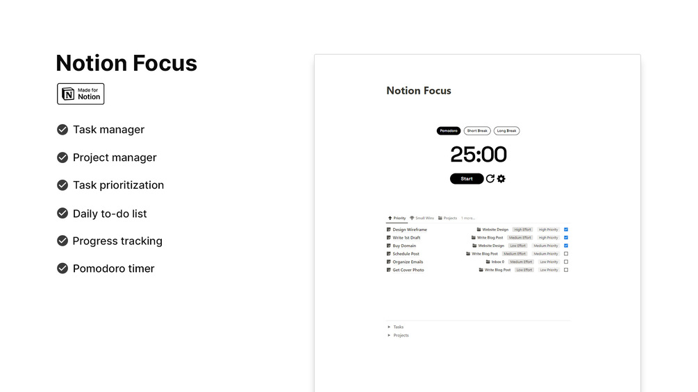 Notion Focus is an intuitive dashboard created for easy project management. This free Notion template allows you to organize your tasks, track project progress, and get the most important things done.