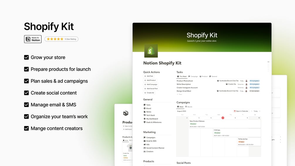 This template is not meant to be a duplicate of your Shopify dashboard - it’s meant to work alongside it. Use Shopify to manage your orders, inventory and customers. This Notion template is the workspace you and your team will use to manage and grow your brand on a daily basis.