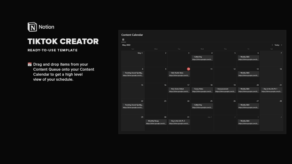 Easily manage your content, sounds, hashtags, goals, strategy and more. I've enjoyed being a TikTok creator growing our business's account over the course of 2022, and I wanted to use my experiences to create something effective for accounts of any size. Whether you're a new or advanced creator, this template will instantly give you an easy workflow to support your growth.